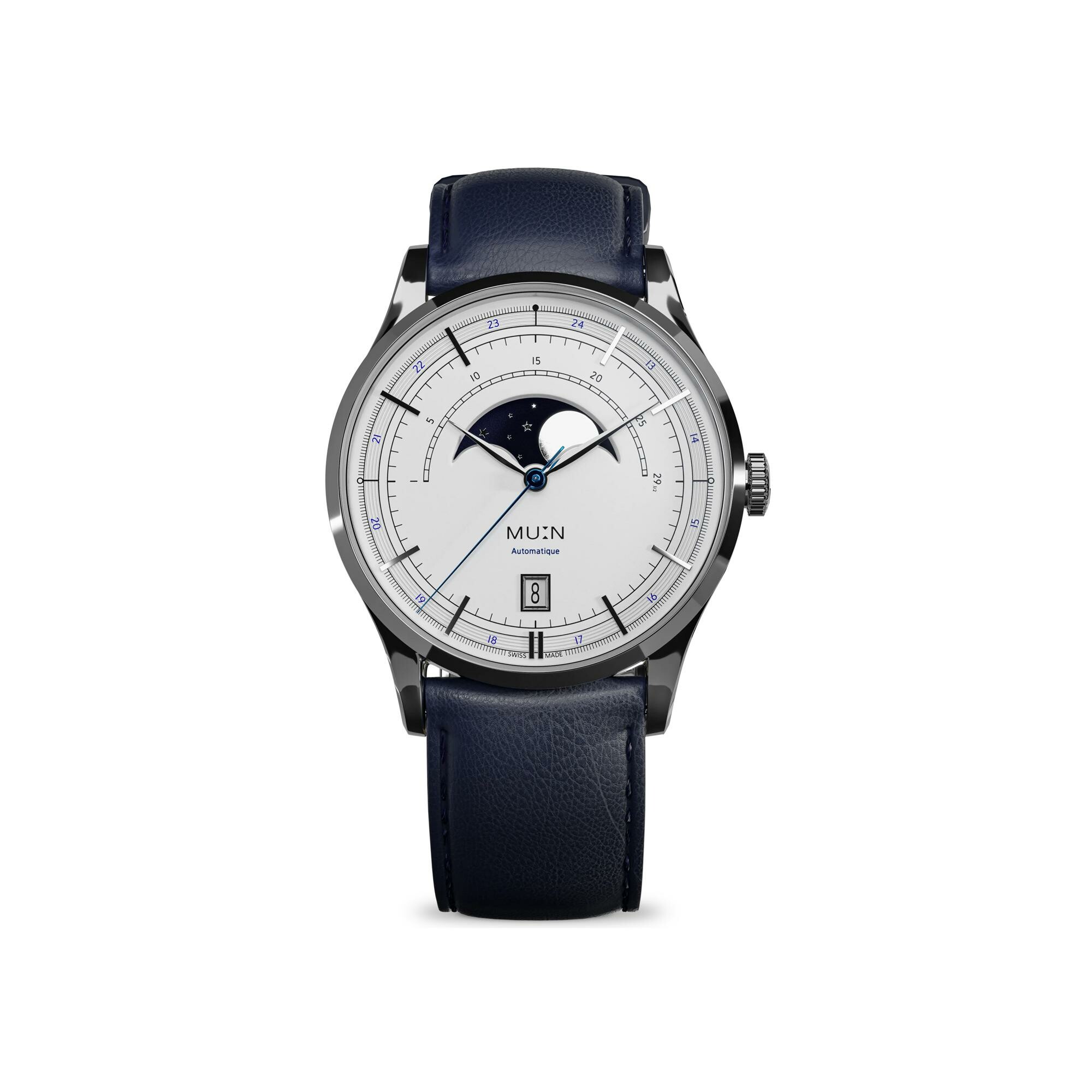 La complication phase de lune est au cœur de l’identité de Mu:n. À la fois poétique et technique, elle incarne le fil conducteur des créations de la marque. Chaque modèle explore une interprétation contemporaine de cette complication, en mettant l’accent sur le réalisme, la lisibilité et l’esthétique.
